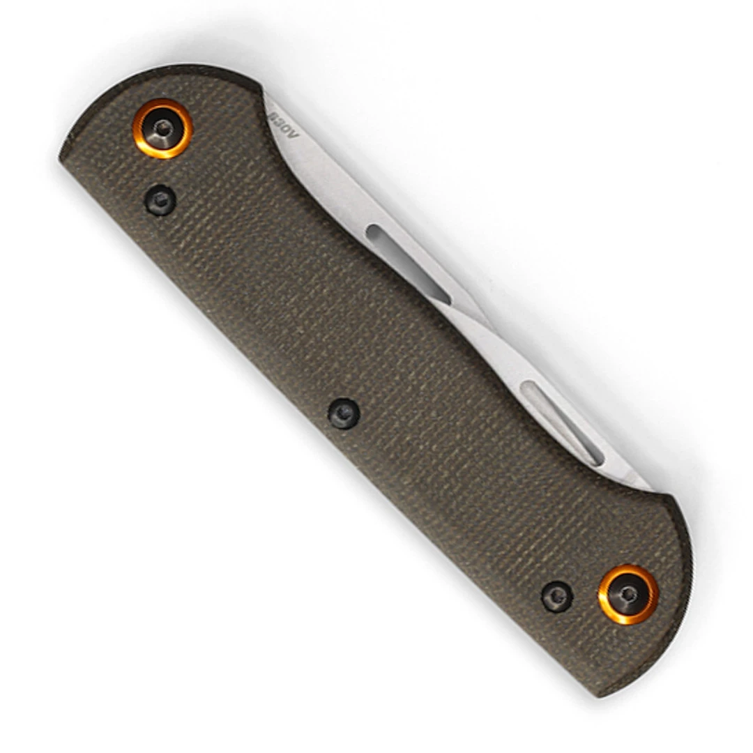 The Benchmade 317 Weekender is the ideal knife for your weekend adventures. This 3-in-1 pocketknife features a clip point blade, a modified spear point blade, and a bottle opener. These two versatile blades are made of premium CPM-S30V steel. The handle of this knife is made of OD Green canvas micarta, textured for a solid, comfortable grip. The handle scales feature stunning orange aluminum pivot rings, contrasting beautifully against the neutral green of the micarta. The 317 Weekender is a redux of the traditional folder pocketknife, providing you with a modern take on a classic pocketknife. This knife has everything you need for basic camp chores, from whittling to opening a cold one by the fire. The 317 Weekender is the perfect everyday carry.Â