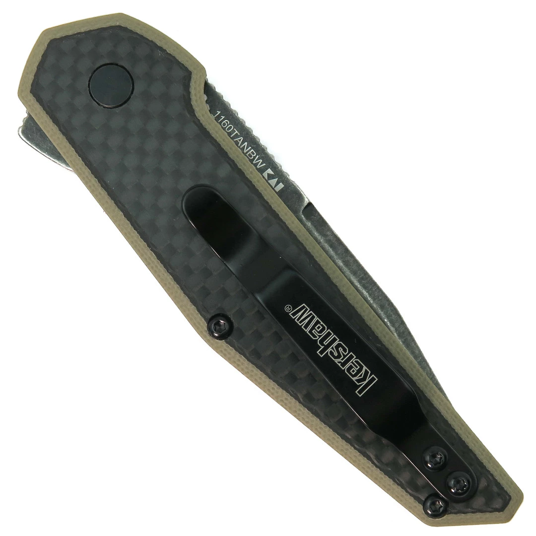 While the Fraxion was one of many new flipper/folders released by Kershaw last year, it now features a fresh new look with all the same characteristics. Designed by Danish knifemaker Jens Anso, this flipper highlights a contemporary package that is slim and sleek and less than 2 ounces. Each model features a liner lock design that has been inset into the handle scale–helping reduce overall weight and allowing the slimness of the profile to really shine and the stainless steel blade is deployed with the ambidextrous spine flipper function while the KVT ball-bearing manual opening system allows for quick fluid action even without the use of any springs. This model features a tan G-10 handle complete with a carbon fiber overlay, a clip point style blade in a blackened stonewash finish and the reversible pocket clip is designed for tip up carry only but is eligible for a left or right hand carry option.