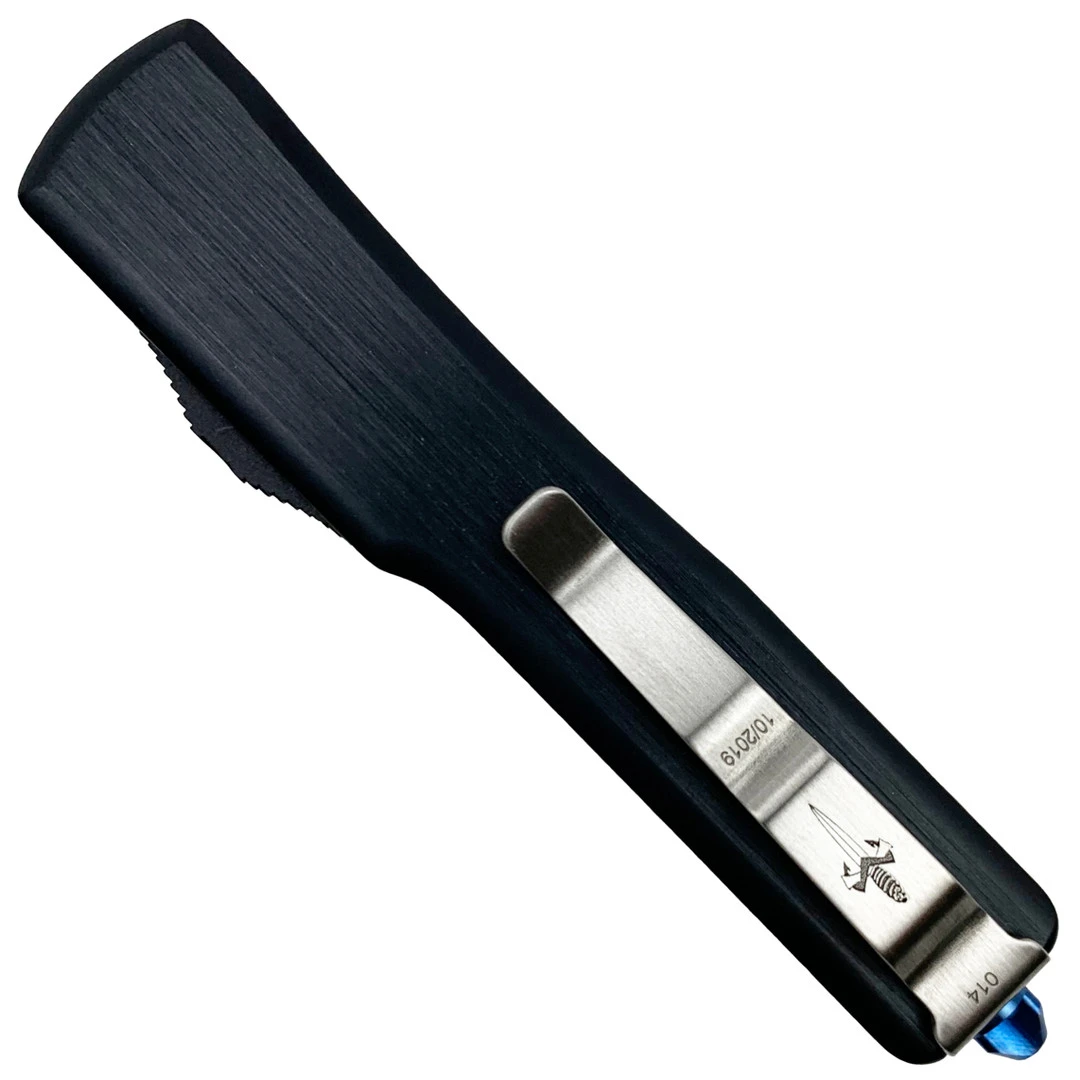 This custom out-the-front model features a hefted anodized aircraft alloy handle and a dagger style blade in a “cracked ice” mirror polish finish.