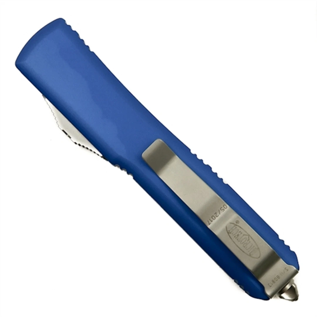 The Ultratech without question has been Microtech’s flagship out the front auto knife since its induction in 1999. Recently it has gone through an additional aesthetic redesign after the overwhelming success and praise of the traditional styling. While the dimensions of the Ultratech remain unchanged, the handle has been stripped back down to its original roots–now offering a smooth contoured chassis, however still boasting the tri-angle hardware, a redesigned thumb slide and the glass breaker that now includes a press fitted ball bearing for a more comfortable, but still functional, user experience. Each Microtech OTF knife has extremely sophisticated internal mechanisms which improve the overall operational functionality and reliability. This model, the 121-10CCBL, features a contoured blue handle complete with standard hardware and an integrated glass breaker function along with a drop point blade in a stonewash finish. Made in the USA.