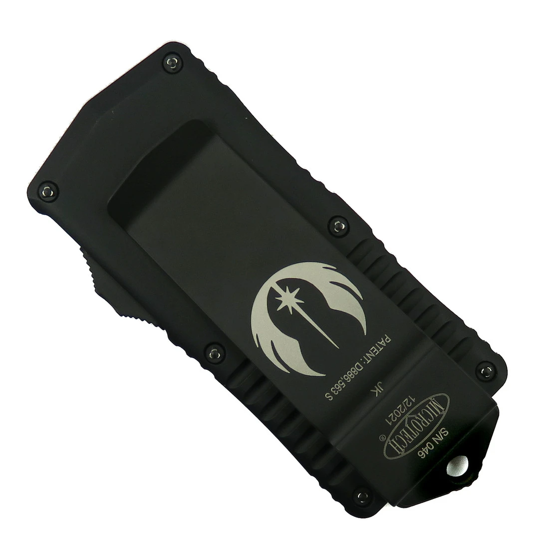 The front of the handle features 3 circle patterns and the clip features the S/N, the Microtech Oval Logo, the birthdate, and the Jedi Knight Logo.