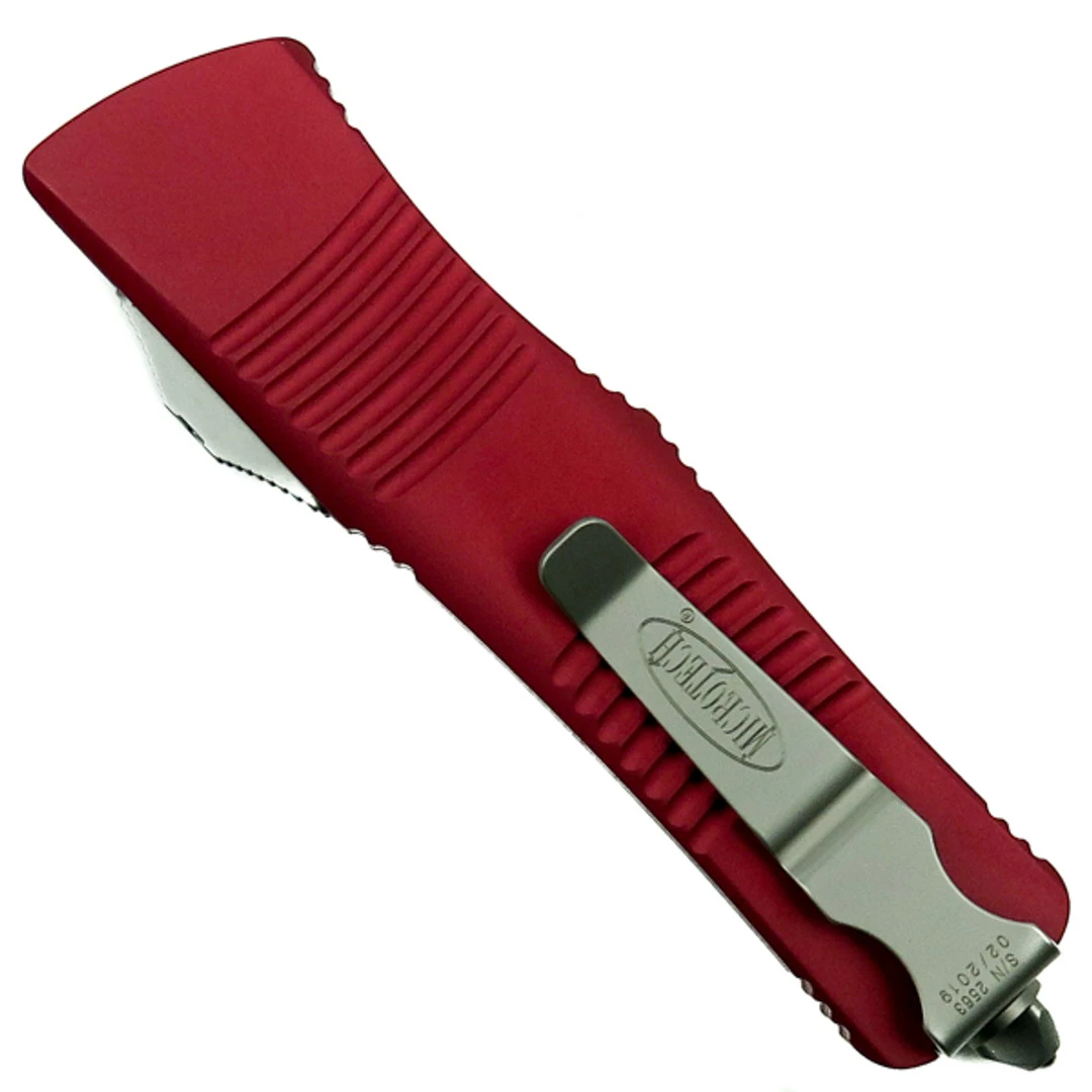 The dual action Troodon stands as one of Microtech’s flagship out the front (OTF) automatics. Built with a slim profile and outstanding ergonomics, the Troodon has been delighting since 2006 with its sophisticated internal mechanisms and snappy action. This model features a red anodized handle complete with standard bead blasted hardware and an integrated glass breaker function along with a dagger style blade in a stonewash finish. Made in the USA.