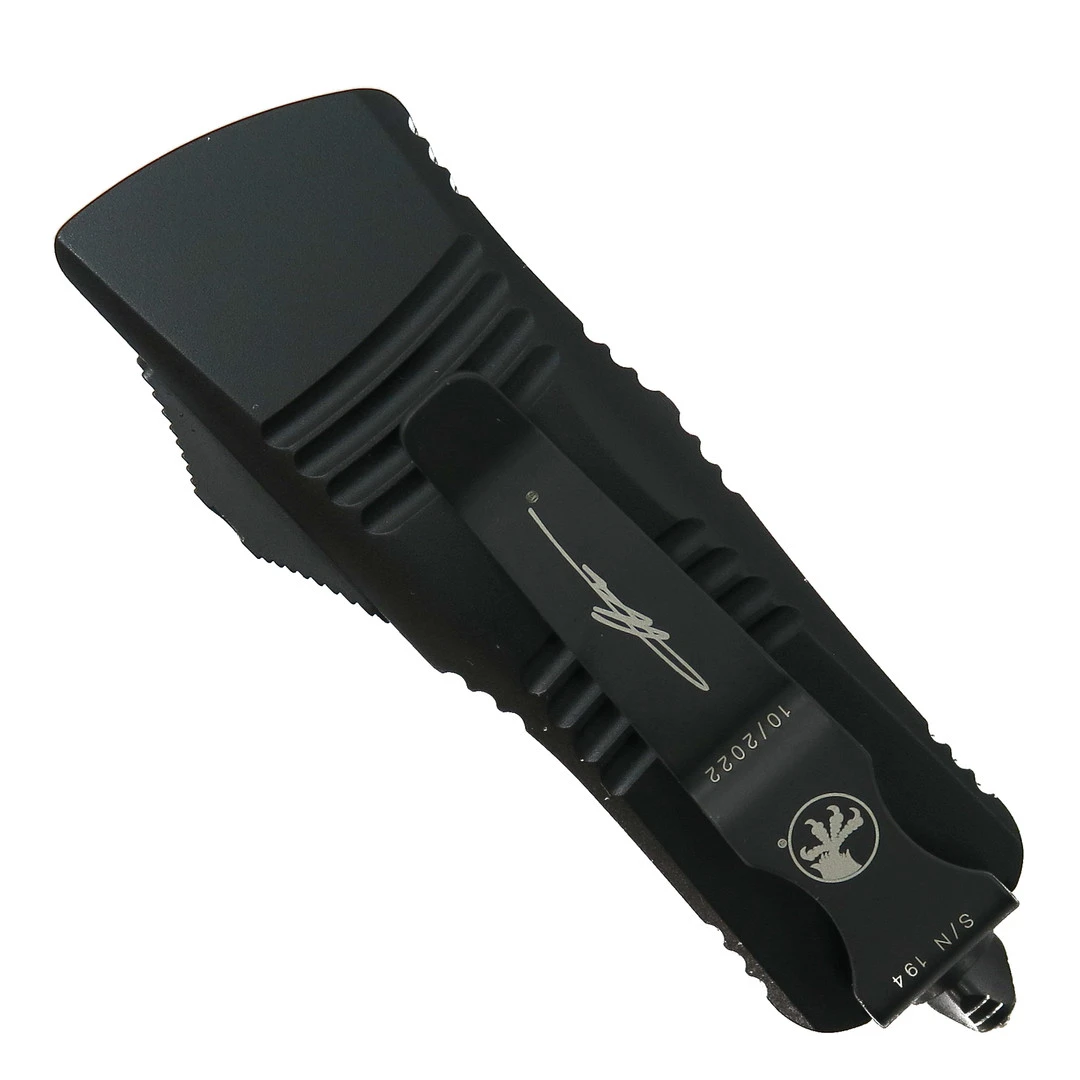 This Microtech Signature Series Mini Troodon OTF knife features a Damascus dagger blade with dual standard edges. The handle features a Carbon Fiber upper and a black anodized lower scale. All the hardware is black.