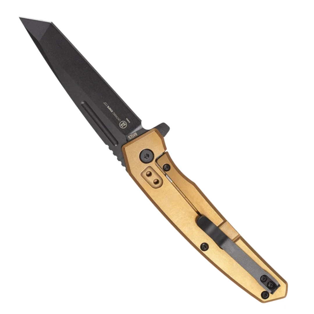 The Ontario Knife Ti-22 Equinox is the striking second installment of the Ti-22 series. This knife features a blade made of CPM-S35VN stainless steel with a black finish. This steel provides great edge retention and corrosion resistance. This tough tanto blade is paired with a vibrant bronze titanium handle. This iridescent, fully titanium handle provides you with toughness as well as a comfortable, contoured grip. This stunning knife is a fantastic everyday carry.Â