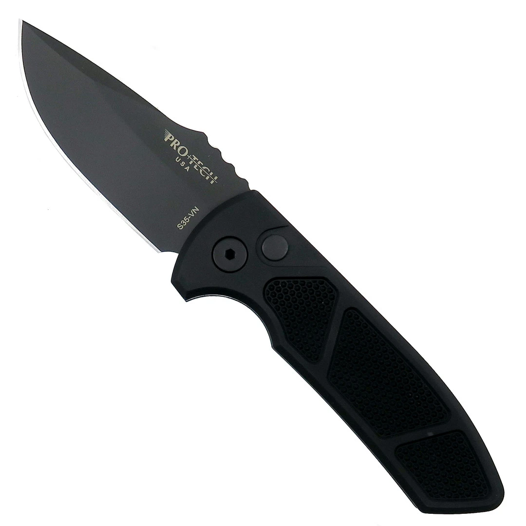 SHOT Show 2019 yielded some very impressive knives but the true front-runner is the Pro-Tech built and Les George designed SBR–short for Short Bladed Rockeye. Stemming from his Marine Corps background, the SBR is a shortened version of his popular Rockeye auto and boasts a stout 1/8″ thick blade stock. Built in 2 distinct variations, each model sports stylized pockets milled into the spine and the deep finger groove promotes excellent grip security. This model features a black anodized aircraft-grade aluminum handle with textured inlays, a drop point style blade in a DLC (Diamond Like Carbon) black finish and the deep carry pocket clip is statically designed for tip up carry only on the traditional side of the handle. Made in the USA.