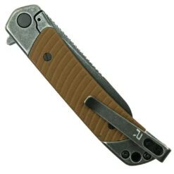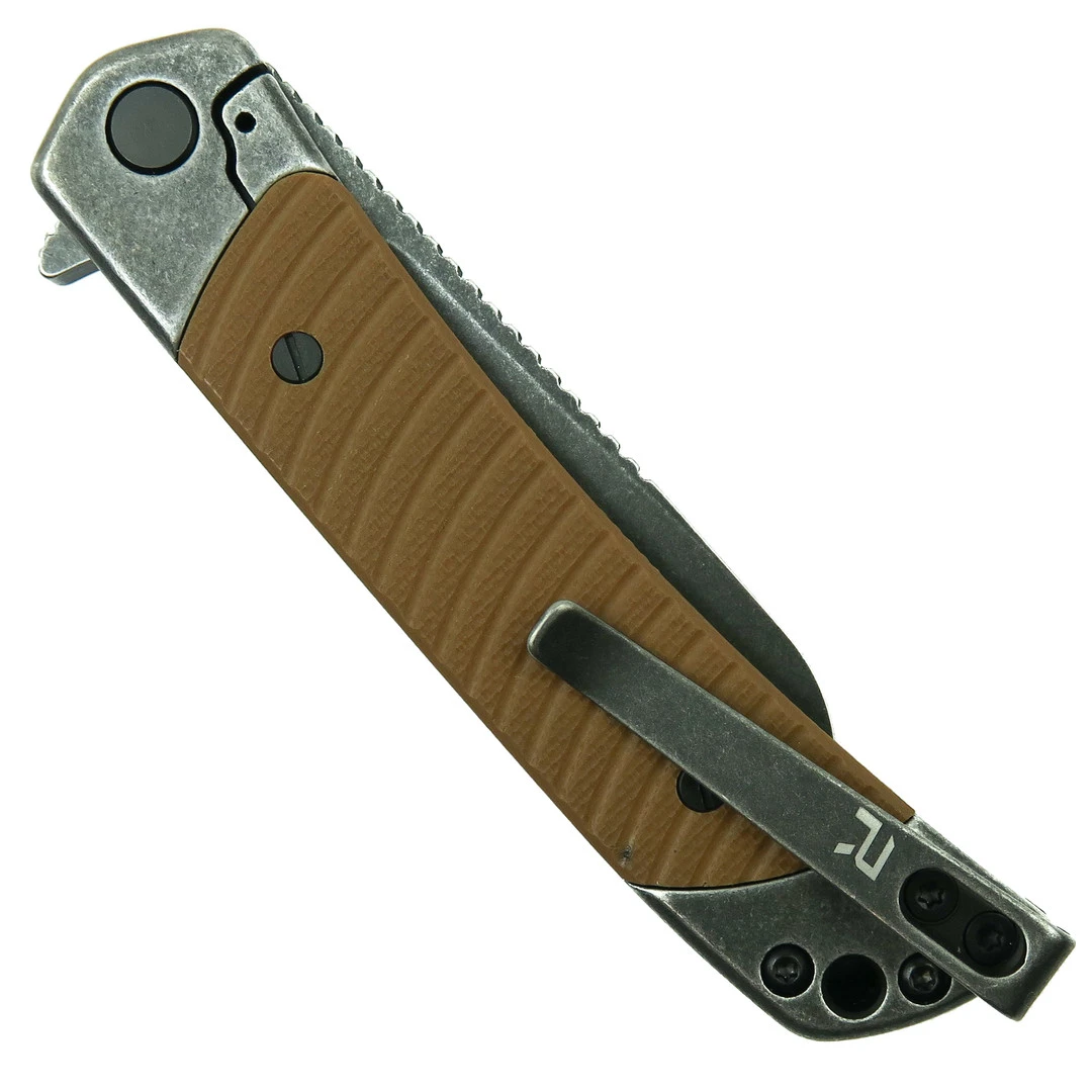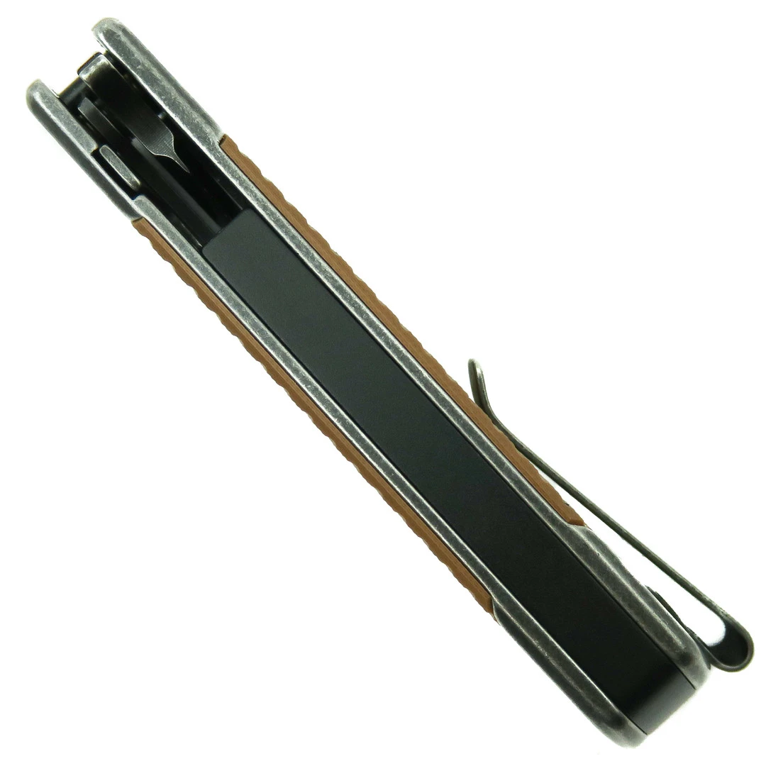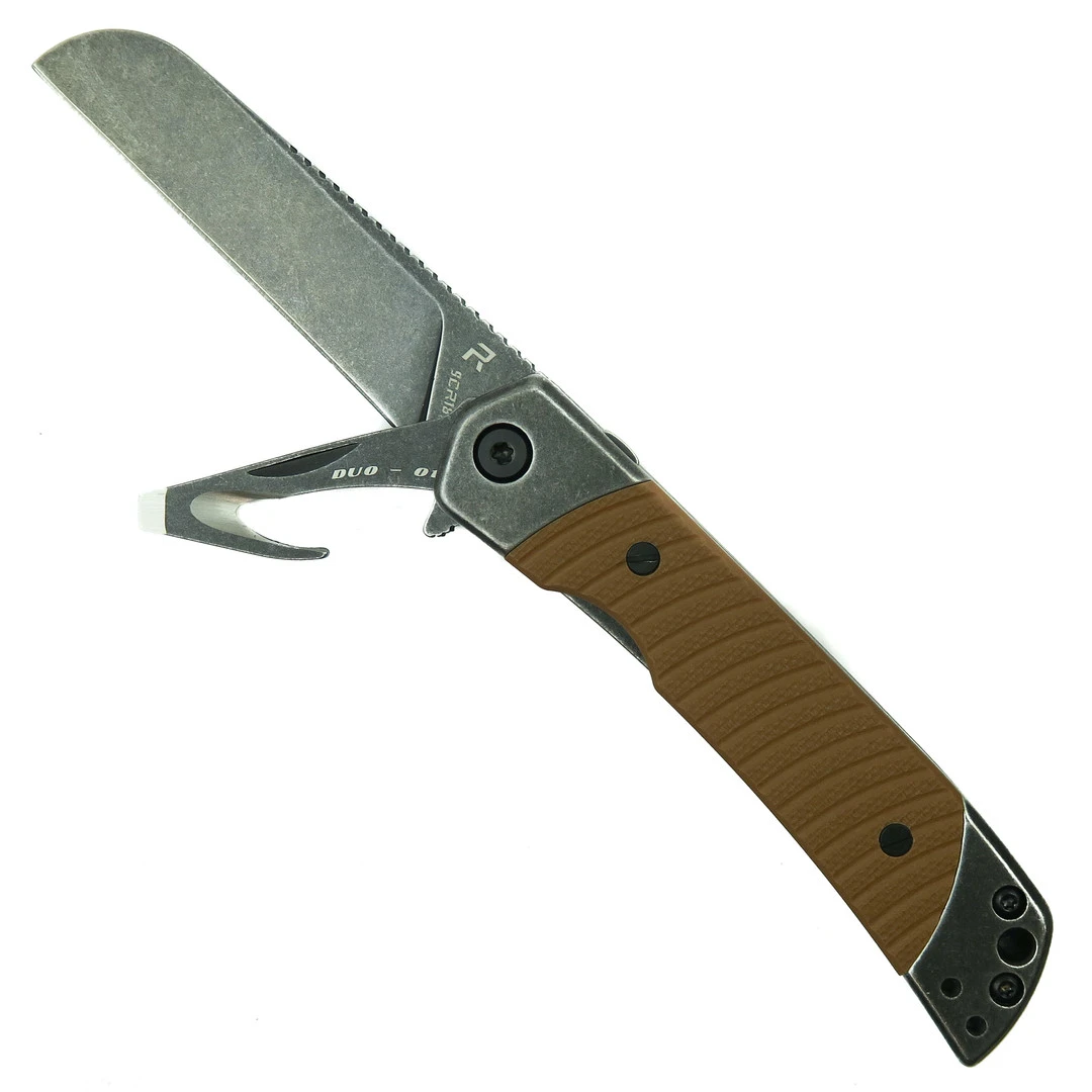 The REVO Duo Brown Sheepsfoot Frame Lock Knife is a handy, lightweight knife. The rescue hook/seatbelt cutter with a slotted drive gives this knife double the abilities while retaining the traditional knife form. The sheepsfoot style blade of this knife is made of 9Cr18MoV stainless steel with a black stonewash finish. This steel provides durability and excellent corrosion resistance. The milled G10 handle scales are comfortable, providing a solid grip. This knife boasts a sleek black backspacer. The main blade opens smoothly with a flipper tab, while the rescue hook tool opens by nail nick. This capable knife is a fantastic everyday carry.Â