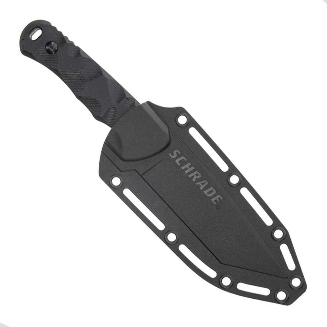 The Schrade Black G10 Regime Tanto Fixed Blade KnifeĀ features a tough tanto blade.This tactical fixed blade knife isĀ made from hard-working material that all but does the job for you. The handle isĀ made of black G10 and is shaped for comfortable hard use. The blade is made of AUS-8 stainlessĀ steel with a powder coated finish. This knife includes a polymer sheath with aĀ carrying clip. This blade is a great addition to any collection.Ā