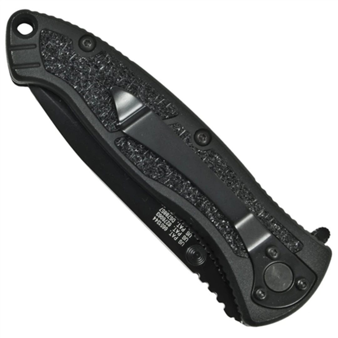 The Smith & Wesson SWATMBS Spring Assist knife snaps out amazingly fast and locks up tight with a linerlock. Using the M.A.G.I.C. (Multipurpose Assisted Generation Innovative Cutlery) system, this knife opens as fast as an auto knife. The SWATMBS features a Drop point combo edge blade with a black finish and a black T6061 aluminum handle with grip inserts, the SWATMBS is an amazing knife that is perfect for daily carry. The blade opens using either the thumb stud or you can press the spine trigger and snap the blade right out. The safety is built right on the side of the handle for easy access. The handle also sports a lanyard hole. Comes with a pocket clip. The SWAT series features three size knives, this model is the medium size knife. SPECIFICATIONS: Blade Type : Drop Point Blade Length : 3.15 in Overall Length : 7.45 in Closed Length: 4.20 in Steel :4034 Stainless Steel, Black Finish Handle Material : Aluminum, Black Weight : 3.5 oz Edge Type :Combo